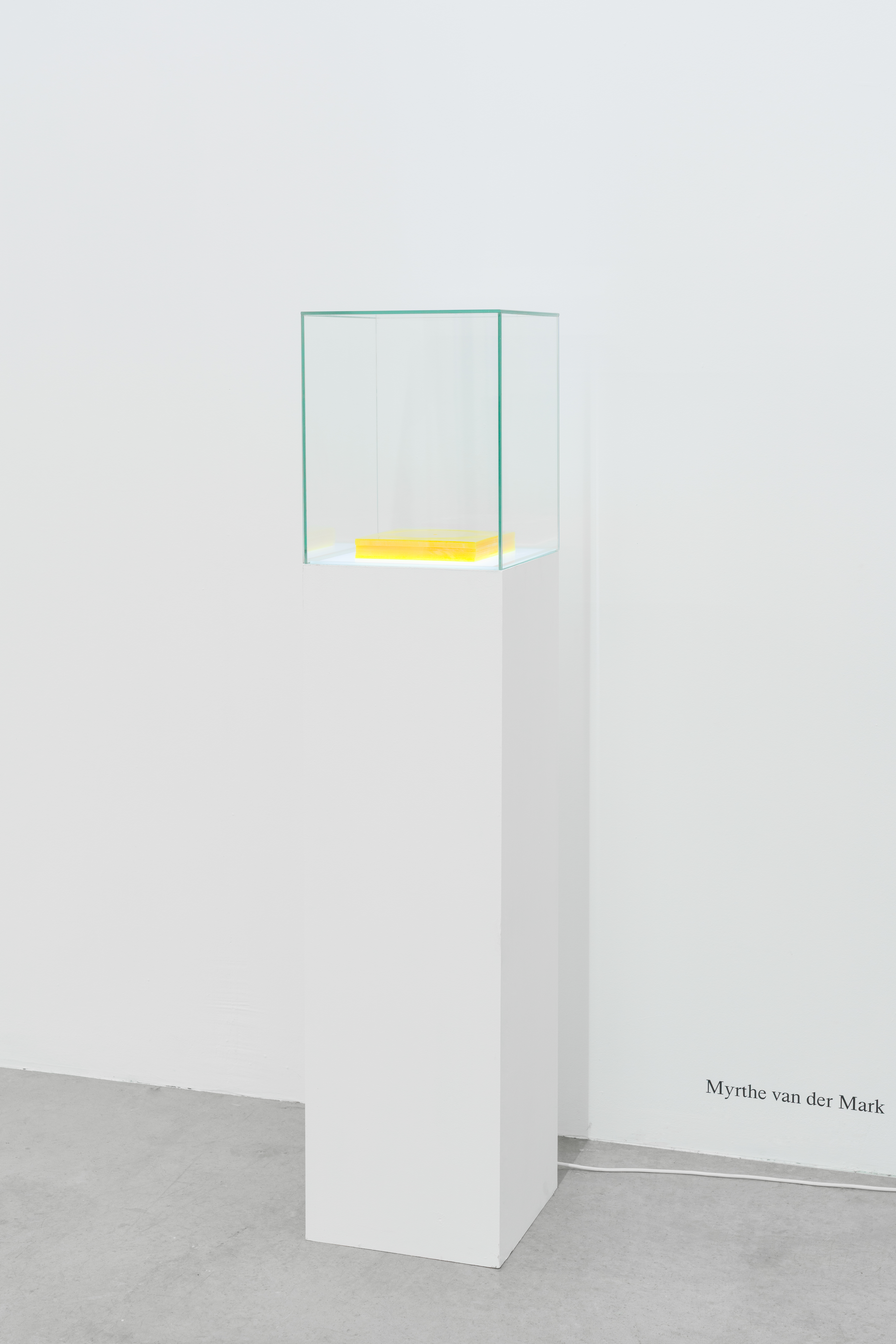 The work on view at Pizza Gallery dovetails with pieces the artist recently exhibited during the third edition of Publiek Park at Plantentuin Meise. The transparent octagonal table, custom-made for her installation in the ornate octagonal Balat greenhouse, returns here. Originally, it served as a platform for four vases containing different preparations (salve, soap, infusion, and watercolour ) made from St. John’s Wort. This herb, traditionally harvested around the summer solstice, also marks the birthday of the artist’s late father and coincided with the opening of Publiek Park.